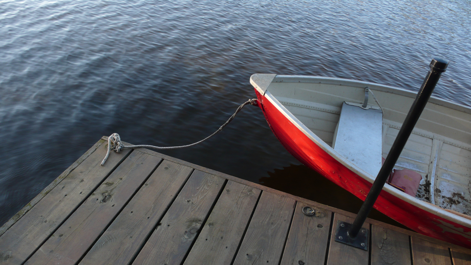 The sun catches a red aluminum boat moored at a dock in Muskoka Bay, Ontario.
