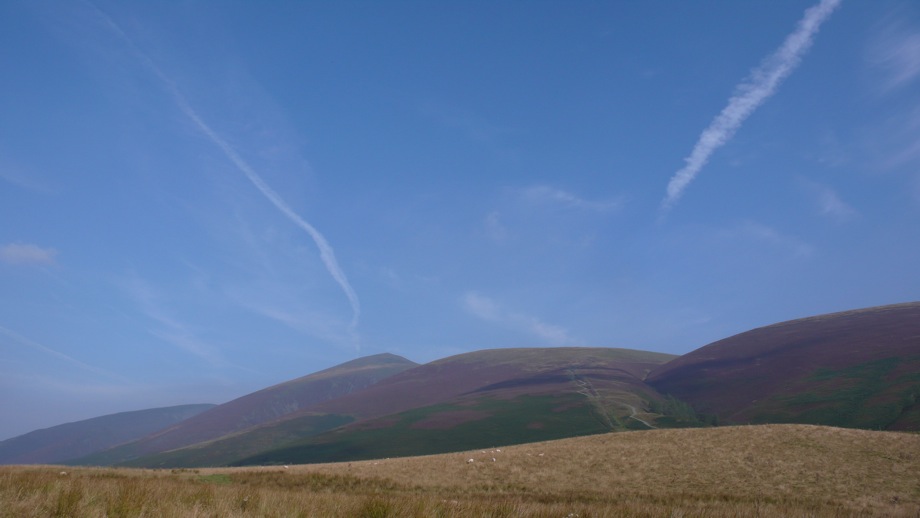 Little Man, one of the heather-covered peaks of the Skiddaw massif, sunny under the sky near Keswick.