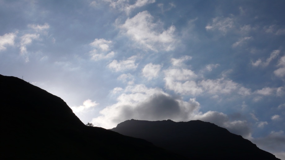 Two stark fells cradle a single tree in the last glow of sunlight behind Buttermere.
