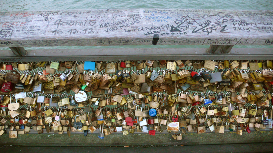 Lovers write their initials on these locks and throw the keys into the Seine below.