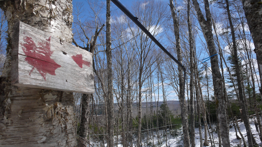 A sign points the way to the old sugaring cabin at Sugar Moon Farm, NS. Note the tubing in the trees, part of a gravity-flow system which brings maple sap downhill to the boiler.
